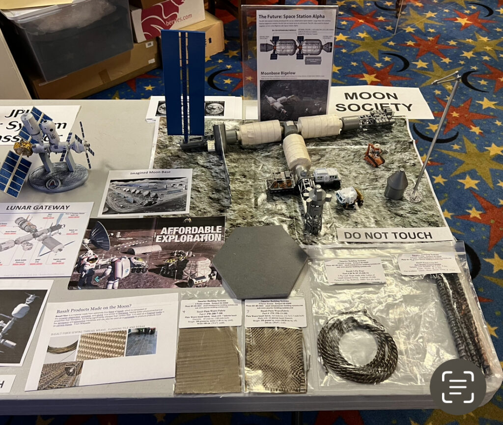 I also presented a model of a proposed Moon base along with 3 rovers and several items made out of simulated lunar basaltic materials: tiles, rebar, rope and fiberglass woven cloth. I talked about how we will be able to use lunar materials for building shelters, landing pads, berms, furniture, cloth, and many other items. And how water ice will supply water for drinking, cooking, waging, growing food, and hydrogen and oxygen for breathing, engine fuel for rockets and rovers, and gases for industrial processing of lunar materials.