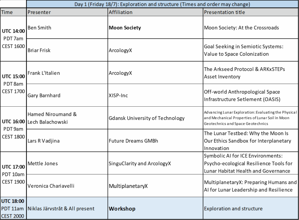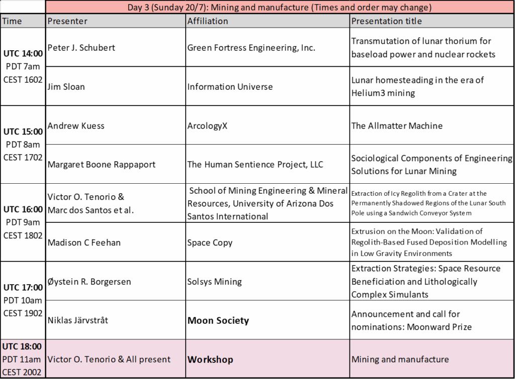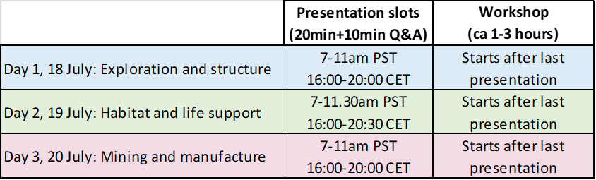 All presentations and workshops will be recorded and made available at the Moon Society Youtube channel. The workshop papers will be made available after the conference, in the post-conference book of abstracts or as independent (white) papers.