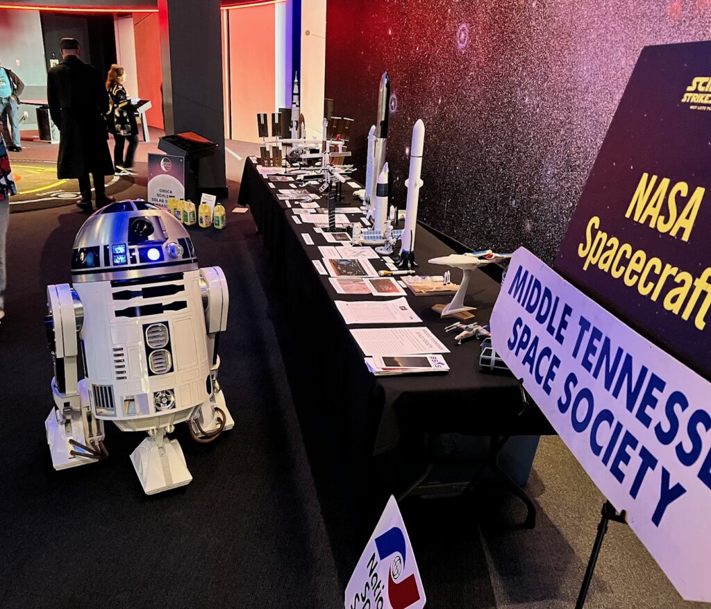 On Friday 5/2, I presented the “Apollo to Artemis and Beyond“ exhibit at the Nashville Adventure Science Center’s “Star Wars Way Late Play Date” from 7-10:00pm. They had ~600 guests, many in costume, and I spoke directly with ~100 guests including R2D2.